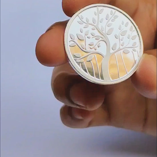 The Banyan Tree Coin 10g is a coin made from 999 purity silver with a high-polish mirror finish, showcasing its elegant and beautiful design. This exquisite coin is an ideal gift for Diwali, especially for Dhanteras, symbolizing wealth and prosperity. The banyan tree, depicted on the coin, represents longevity, stability, and growth—qualities that add meaningful value to this special piece. Combining craftsmanship with cultural significance, this coin is perfect for those seeking a refined and auspicious gift.