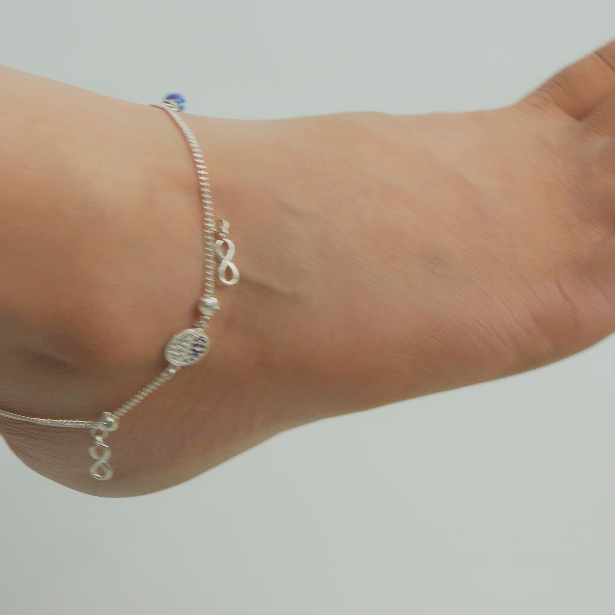 Crafted from 92.5% pure sterling silver, the Infinity Evil Eye Ward Anklet features a high-polish finish and a delicate infinity symbol intertwined with silver beads. Designed to elegantly complement any style, this anklet serves as a protective talisman against negative energy while promoting good luck. Its sophisticated design and quality craftsmanship make it a refined accessory for discerning women seeking both beauty and meaningful symbolism.