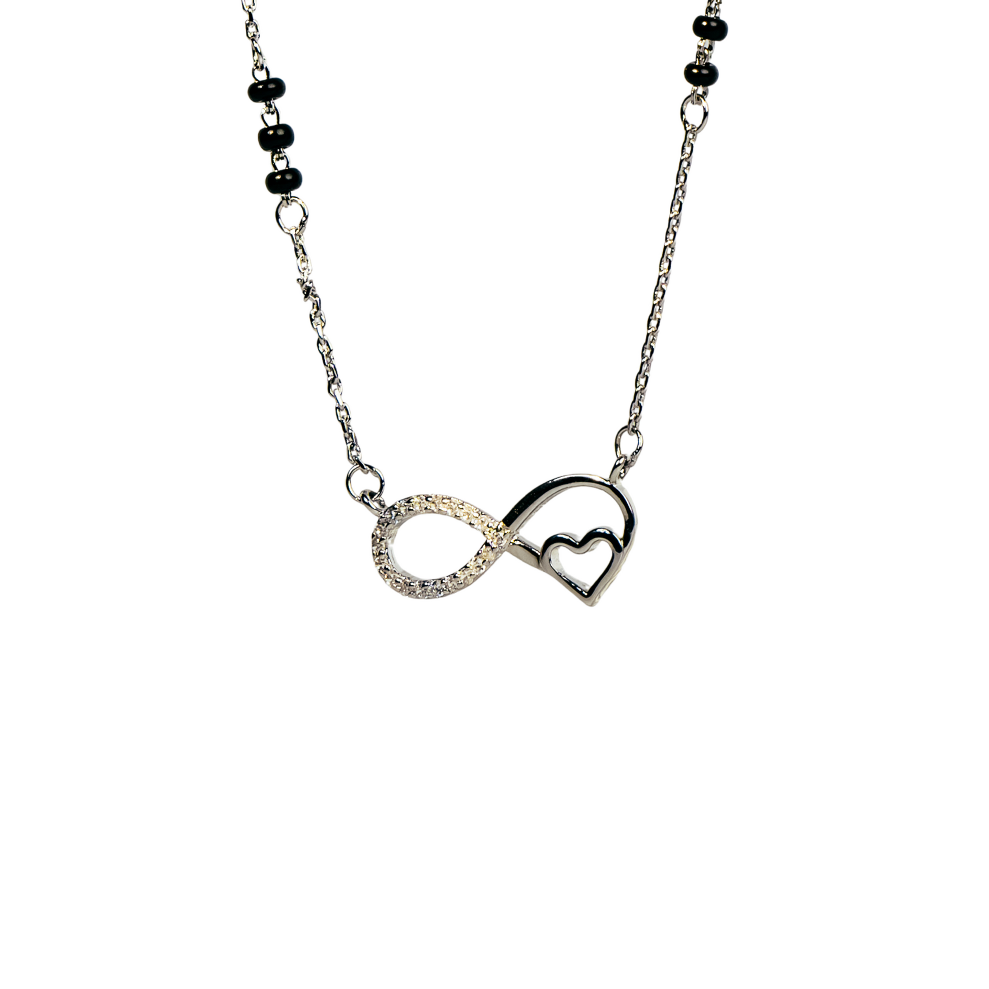 Crafted from 92.5% pure sterling silver, this Infinity Heart Chain MangalSutra features a delicate design accented with sparkling white zircon stones and classic black beads. Its high-polish finish enhances elegance, making it a refined choice for women who appreciate timeless beauty combined with cultural significance. This piece balances sophistication and tradition, ideal for elevating any ensemble with subtle grace.